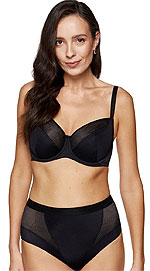 Koszulka z delikatnej, elastycznej siateczki w połączeniu z efektowną koronką zdobioną turkusowym wzorem. Miękkie miseczki z fiszbinami, na ich łączeniu zapięcie typu click oraz satynowa kokarda. Ramiączka z regulacją. Do kompletu koronkowe stringi. Skład: 94% poliamid, 6% elastan.