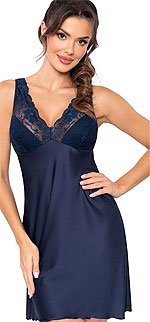 Satynowa koszula nocna granatowa Mari pięknie połyskuje i delikatnie opływa ciało, zapewniając elegancję i komfort. Dekolt subtelnie ozdobiony delikatną koronką, dodającą kobiecego uroku i romantycznego charakteru. Cienkie, regulowane ramiączka pozwalają na idealne dopasowanie do sylwetki.