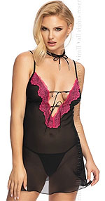 Czarna, zmysłowo prześwitująca koszulka nocna z głębokim, kuszącym dekoltem. Bogato zdobiona w tym miejscu różową, delikatną koronką, z dwoma ozdobnymi tasiemkami, które możesz przewiązać na kokardkę. No dalej! Załóż to wdzianko i słodko sprowokuj Jego spojrzenie! Stringi w komplecie. Ps. Ozdoba na szyję nie należy do zestawu. Skład: Poliester 94%, Poliamid 5%, Elastan 1%. |