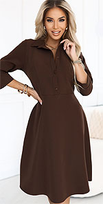 Zakładasz sukienkę midi Numoco Basic w kolorze czekoladowego brązu - i nagle cała stylizacja „klika”. Kołnierzyk porządkuje look, gładka linia układa sylwetkę, a Ty czujesz ten spokojny rodzaj pewności siebie, który widać od progu.