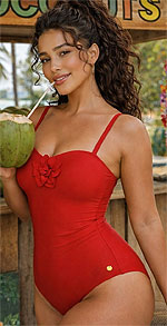 Elegancki kostium kąpielowy - z usztywnianymi miseczkami - zdobiony naszytym kwiatem pomiędzy miskami - regulowane, nieodpinane ramiączka - wysokiej jakości materiał, szybkoschnący, odporny na chlor i słońce - dopracowana konstrukcja modelu idealnie dopasowuje się do sylwetki - doskonały model basenowy jak również plażowy - tył typu "łezka" doskonale wysmukla sylwetkę - odporny na chlor Skład: 85% poliamid, 15% elastan |