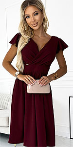 Matilde - rozkloszowana sukienka z kopertowym dekoltem i krótkim rękawkiem. Uszyta z lekko elastycznego materiału w kolorze bordowym. Marka numoco. Produkt polski.