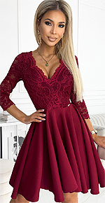 Nicolle - asymetryczna sukienka z dłuższym tyłem, rękawkiem 3/4 i koronkowym dekoltem. Kolor: bordowy. Z tyłu zapinana na zamek. Wzór koronki może się nieznacznie różnić.