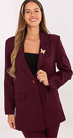 Bordowa elegancka marynarka damska.Marynarka z podszewką i broszką.Wymiary marynarki w rozmiarze S mierzone na płasko: szerokość pod pachami - 53 cm, długość rękawa - 62 cm, szerokość w talii - 50 cm, szerokość w biodrach - 59 cm, długość całkowita - 81 cm.Skład materiału