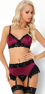 Piękny, uwodzicielski komplet bielizny o eleganckim kroju, to wyjątkowo delikatna satyna w kolorze bordo i kunsztowna koronka, w odcieniu głębokiej czerni. Satynowy biustonosz na cienkich, regulowanych ramiączkach zdobiony koronką. Dekoracyjny pas do pończoch, z tyłu zmysłowo wiązany czarną tasiemką, to również połączenie satyny i koronki, w komplecie stringi.Skład Materiałowy: 92% POLIESTER 8% ELASTAN