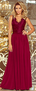 Bordowa długa suknia maxi z koronkowym dekoltem - bez rękawków. Sukienka delikatnie odkrywa ramiona, pięknie eksponuje dekolt i plecy. Produkt polski.