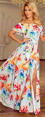 Niesamowita, długa suknia z dekoltem falbanką typu hiszpanka. Całość zdobią duże, malowane, kolorowe kwiaty. Długość maxi z kuszącym rozcięciem. Luźny, zwiewny dół dodaje komfortu użytkowania oraz dodaje niezwykłej kobiecości. Sukienka, która sprawdzi się na każdą okazję. |