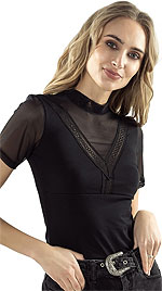 Bluzka damska z półgolfem - wysoka jakość bawełna - dekolt i rękawy z tiulu - krótki rękaw Skład: 80% bawełna, 15% poliamid, 5% elastan |