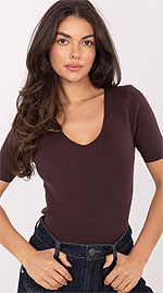Stylowy sweter damski wykonany z elastycznej mieszanki wiskozy, poliestru i poliamidu, która zapewnia komfort noszenia i swobodę ruchów. Model ma standardową długość oraz krótki rękaw, a dekolt w serek (V) subtelnie podkreśla linię szyi. Sweter wykonany z prążkowanego materiału, utrzymany w gładkim, dominującym wzorze, świetnie sprawdzi się w stylizacjach casualowych, codziennych oraz do pracy. To uniwersalny element garderoby, który łatwo zestawić zarówno z jeansami, jak i spódnicą czy spodniami materiałowymi. Wymiary swetra w rozmiarze one size mierzone na płasko: szerokość pod pachami - 39 cm, długość rękawa - 26 cm (od szwu), długość całkowita - 63 cm, szerokość w biodrach - 38 cm (materiał rozciągliwy).Skład materiału