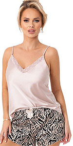 Satynowa piżama damska beżowa Sheila 1/2 z jedwabnej satyny to idealne połączenie luksusu, komfortu i modnego designu. Górę zestawu stanowi beżowy top na cienkich, regulowanych ramiączkach. Wykończony subtelną koronką nie tylko zapewnia wygodę, ale także dodaje romantycznego uroku. Delikatny połysk materiału pięknie odbija światło i podkreśla kształty, tworząc elegancką i uwodzicielską stylizację na noc.