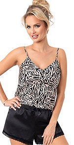 Satynowa piżama damska czarna Sheila 1/2 z jedwabnej satyny to idealne połączenie luksusu, komfortu i modnego designu. Górę zestawu stanowi top na cienkich, regulowanych ramiączkach, pokryty efektownym, zwierzęcym printem, który nadaje całości drapieżnego charakteru. Delikatny połysk materiału pięknie odbija światło i podkreśla kształty, tworząc elegancką i uwodzicielską stylizację na noc.