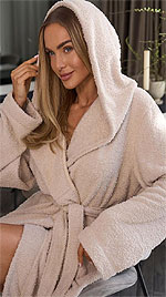 Krótki szlafrok damski, z kapturem - miękka, charakterystyczna dzianina - długi rękaw - wiązany w pasie, z kieszeniami Skład: 100% poliester |