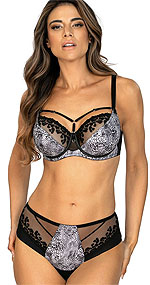 Biustonosz miękki soft z paseczkami Zahara B-555 w efektownym wydaniu z motywem panterki i subtelnymi haftami. Miseczki wykonane są z lekkiej, transparentnej siateczki z delikatnym haftem liści, które pięknie eksponują biust, jednocześnie zapewniając jego komfortowe podtrzymanie dzięki wszytym fiszbinom. Górna część miseczek ozdobiona została finezyjnymi paseczkami biegnącymi przez dekolt, co dodaje całości odważnego, nowoczesnego charakteru. Biustonosz posiada regulowane ramiączka oraz klasyczne zapięcie na plecach, co umożliwia indywidualne dopasowanie.