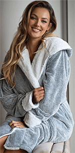Wnętrze oraz wykończenia rękawów obszyto kremowym materiałem frotte, który dodaje całości przytulności i ciepła. Szlafrok ma długość przed kolano, dzięki czemu prezentuje się lekko i kobieco. Pomimo puszystej struktury jest niezwykle lekki, co sprawia, że idealnie sprawdza się zarówno po kąpieli, jak i podczas leniwych poranków.