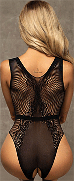 Kuszące czarne body z elastycznej siateczki z dużymi oczkami ozdobione wzorem w pionowe i poziome pasy, z otwartym krokiem.