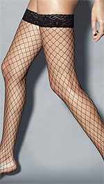 Pończochy samonośne, matowe w stylu kabaretek z dużymi oczkami. Wykończone koronką na silikonie (dwa paski silikonu). Niewidoczne wykończenie w palcach.